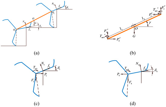 Next, the statics analysis of the entire robot during climbing steps is conducted. As shown in Figure 2, f1, N1, f4, and N4 are the friction and pressure of the robot when its front and rear wheel-legs come into contact with a step; P1, F1, P4, and F4 are the component force of the robot body on the wheel-leg in the horizontal and vertical directions; P1′, F1′, P4′, and F4′ are the reaction forces of P1, F1, P4, and F4, respectively; Tm1 and Tm4 are the driving torque of the front and rear drive motors on the wheel-leg, respectively; Tm1′ and Tm4′ are the reaction torques of Tm1 and Tm4, respectively; G is the gravity of the robot; MO1(f1) and MO1(N1) are the torque of f1 and N1 at the geometric center O1 of the front wheel-leg, respectively; MO4(f4) and MO4(N4) are the torque of f4 and N4 at the geometric center O4 of the rear wheel-leg, respectively; l1 and l2 are the distance from point O to O1 and O2, respectively; and γ is the angle between the robot body and the horizontal line. Ignoring the gravity of the wheel-leg, it is assumed that the force condition of the front and rear wheel-legs is the same. Then, Formula (3) can be obtained from the force balance of the robot:
