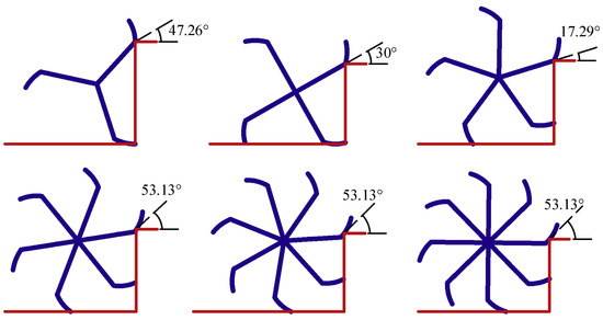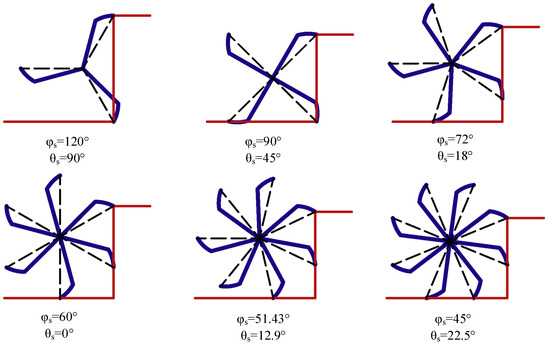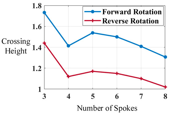 Based on the above analysis, the forward and reverse obstacle-crossing capability of wheel-legs with different numbers of spokes can be obtained, as shown in Figure 5. It can be seen that the obstacle-crossing capability of a wheel-leg declines with an increase in the number of spokes s. Therefore, to achieve the strongest obstacle-crossing capability, we use s = 3.