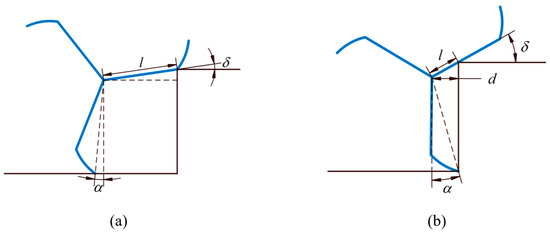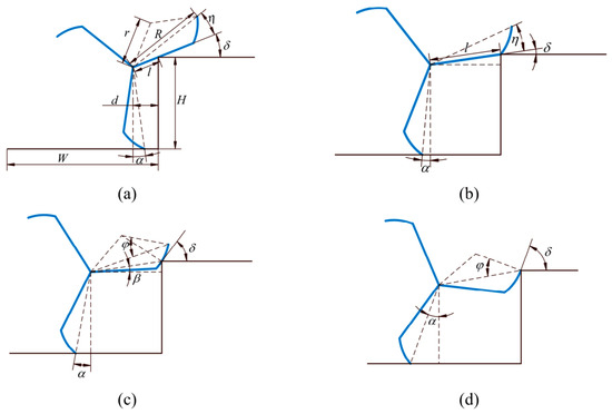 The straight-line part and circular-arc part of the straight-curved wheel-leg have different contact situations with steps during climbing and should be classified and analyzed to obtain the range of geometric parameters that allow step climbing. According to the statics analysis of wheel-leg step climbing and based on the structural characteristics of the wheel-leg, the main circumstances of the robot’s step crossing are divided into several types, as shown in Figure 8: