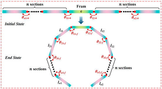 To further expand the application scenarios of the robot, a curling mechanism is selected as the robot’s main body to make the robot move more smoothly. The robot’s curling structure is shown in Figure 10. According to the configuration of the robot’s curling mechanism and the requirements for stability of the curling procedure, two indicators are proposed from the evaluation of kinematics and dynamics: the roundness R of the robot’s curling at the end state and the torque fluctuation TF of the curling procedure. R represents the sum of the difference between each joint angle and π. The smaller the value of R, the greater the roundness. TF reflects the motion stability of the robot during the curling procedure. The smaller the TF, the better the motion stability of the robot. The specific expressions for R and TF are as follows: