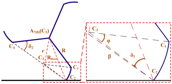 The structure of the wheel-leg is shown in Figure 14. Since the structure of all wheel-legs is the same, we consider one of them for motion analysis. The center point A7(8) of the wheel-leg is equivalent to C5. The inferior arc C1C2 has C3 as the center and r as the radius. The angle between each wheel leg is 2/3π. The length of C2C5 is Rmax, the length of C1C5 is R, the angle between C1C3 and C2C3 is φ, the angle between C2C3 and C2C4 is β, the angle between C2C5 and C2C4 is δ1, and the angle between C4C5 and C2C4 is δ2.