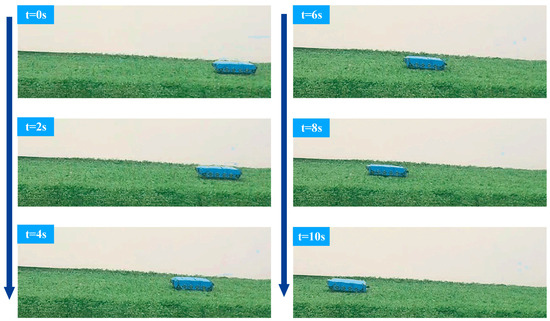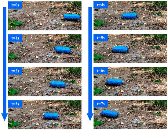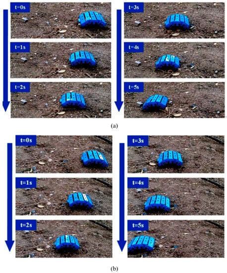 The appearance of the robot prototype is shown in Figure 15a. The shell was made of aluminum alloy and the bottom plate was made of resin, so as to reduce the weight of the robot. The motor shaft’s fixing parts and wheel-leg were all made of carbon steel, which can improve the strength of the robot. There are threaded fixing holes on the sides of the two parts to fix the parts and the motor’s D-shaft. Non-slip materials were added to the wheel-leg to increase the friction of the robot when crossing obstacles and climbing slopes, which improves the efficiency of the robot’s operation.
