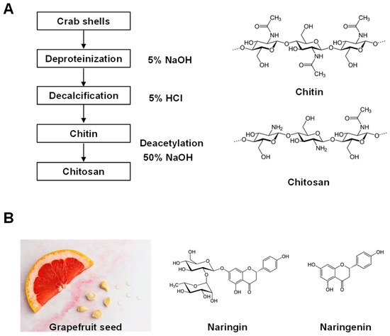Manufacturing process of deacetylated chitosan and GSE main compounds. (A) Manufacturing process and chemical structure of deacetylated chitosan. (B) GSE and structures of naringin and naringenin.