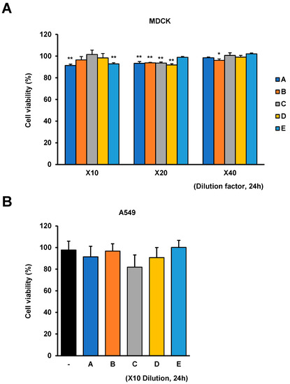 Dog MDCK and human A549 lung cancer cells obtained from American Type Culture Collection (Manassas, VA, USA) were cultured in a growth medium of Dulbecco’s modified eagle medium with 10% fetal bovine serum (FBS) and 1% penicillin/streptomycin. Images of cells were obtained using a CELENA® S Digital Imaging System fluorescence microscope (Logos Biosystems, Anyang, Republic of Korea). Cell viability was measured using an 3-(4,5-dimethylthiazol-2-yl)-2,5-diphenyl-2H-tetrazolium bromide (MTT) assay kit (CellTiter 96®; Promega, Madison, WI, USA) following the manufacturer’s instructions. Briefly, cells were seeded in 96-well plates and incubated under the indicated experimental conditions. MTT reagent was added to each well, and the plates were incubated at 37 °C for 4 h. After incubation, stop solution was added to each well and absorbance was measured at 570 nm using a Multiskan SkyHigh microplate spectrophotometer (Thermo Fisher Scientific, Waltham, MA, USA).
