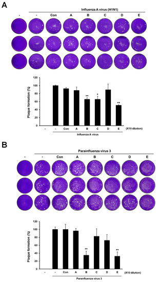 Antiviral activity of deacetyl-chitosan in combination with GSE against H1N1 and HPIV3. (A) Plaque assay images of H1N1-infected MDCK cells treated with or without deacetyl-chitosan (upper panel). Quantitative data for plaque formation (%) are presented as the mean ± SEM from three biological replicates (n = 3) (lower panel). (B) Plaque assay images (upper panel) and quantitative data (lower panel) for HPIV3 were performed in the same manner. A (60% deacetylated chitosan), B (85% deacetylated chitosan), C (GSE), D (60% deacetylated chitosan + GSE), and E (85% deacetylated chitosan + GSE) are shown in Table 1. Statistical comparison between groups was performed using Student’s t-test in all figures. Control group was compared to treatment group from three biological replicates (n = 3). * p < 0.05, ** p < 0.01.