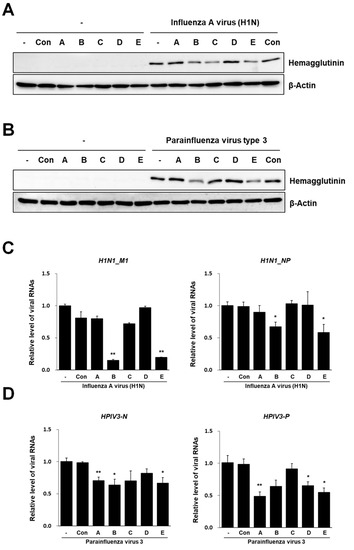 Assessment of antiviral activity of deacetyl-chitosan in human A549 cells. (A,B) HA protein levels of H1N1-infected (A) or HPIV3-infected (B) A549 cells treated with or without deacetyl-chitosan. Whole-cell lysates were analyzed by western blot using antibodies on the right. (C) qRT-PCR of H1N1_M1 and H1N1_NP expression in H1N1-infected A549 cells. (D) qRT-PCR of HPIV3-N and HPIV3-P expression in HPIV3-infected A549 cells. Quantitative data for gene expression are presented as the mean ± SEM from three biological replicates (n = 3). A (60% deacetylated chitosan), B (85% deacetylated chitosan), C (GSE), D (60% deacetylated chitosan + GSE), and E (85% deacetylated chitosan + GSE) are shown in Table 1. Control group was compared to treatment group from three biological replicates (n = 3). * p < 0.05, ** p < 0.01.