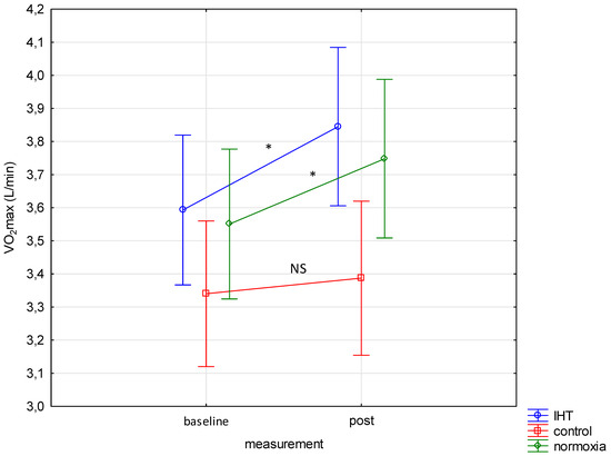 Effect of interval training in normoxia (NT) and in hypoxia (IHT) on absolute maximal oxygen uptake (VO2max) (*: p < 0.05; NS: non-significant; vertical bars indicate 0.95 confidence interval).