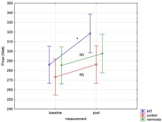 Effect of interval training in normoxia (NT) and in hypoxia (IHT) on maximal power output (Pmax) (*: p < 0.05; NS: non-significant; vertical bars indicate 0.95 confidence interval).