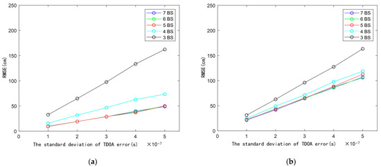 Error curves of the Chan algorithm and Taylor algorithm with different numbers of base stations and different TDOA errors. (a) Error curves of the Chan algorithm; (b) error curves of the Taylor algorithm.