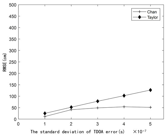 Figure 4 shows that the performance of the Chan algorithm is superior to that of the Taylor algorithm when four base stations are used in the positioning system in the Gaussian noise environment. The Chan algorithm can use all TDOA information to obtain a more accurate solution, so it can adapt to different measurement environments.