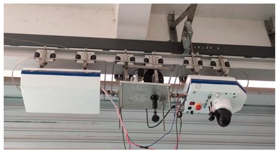 The physical object of the rail-mounted logistics robot designed in this paper is shown in Figure 5, which is composed of three parts: material storage bin, power supply bin, and control bin. The control bin of the robot includes a control device, a data acquisition device, a driving device, etc. The internal layout of the robot control bin is shown in Figure 6, which mainly includes the main controller RK3588, the co-controller STM32F1, the power module, the UWB positioning module, etc. Figure 7 shows the application scenario of a rail-mounted logistics robot.