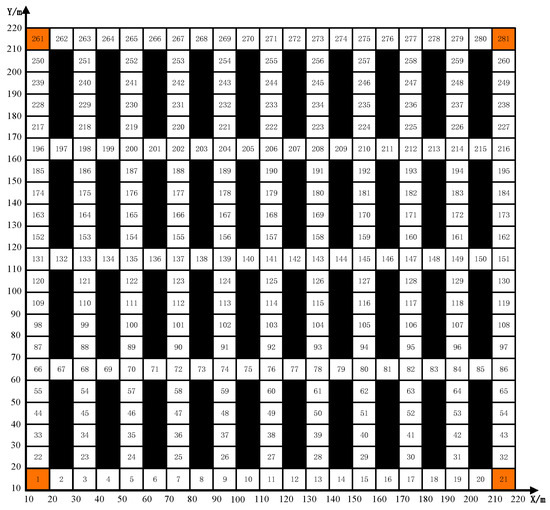 In order to verify the feasibility of the aforementioned path-planning algorithm, Matlab is used to verify the algorithm combined with an example. Figure 8 shows the simulation diagram of the running environment of the rail-mounted robot. The workshop map layout is created using the raster method. Among them, the white grid represents the track, which is a passable path. The black grid represents the impassable path. The orange grid represents the material station in the workshop. The grid number represents the workstation number. The mode of operation of the robot in orbit is a two-way single lane.