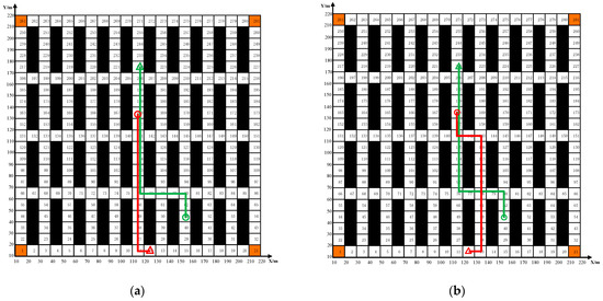 To sum up, in this case, when the robots encounter conflict in opposite directions, the replanning strategy takes 14.28% longer driving distance than the delayed waiting strategy, but the replanning strategy takes 17.82% less time than the delayed waiting strategy. Therefore, the replanning strategy was chosen to improve the efficiency of material distribution. After replanning, the driving paths of the two robots are shown in Figure 10b.