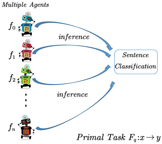 In order to further explore the potential of dual inference, we introduce multiple dual inference models into the learning system. In dual structures, all models in the same direction map the space X to the space Y (or vice versa), resulting in functional similarities and variabilities. In this study, we generate multiple pairs of different models through independent training using random seeds with different initializations and data access orders. Each proxy model output provides feedback signals to or , enabling the models to receive additional gains during training. Having multiple proxy models generally leads to more reliable, robust, and comprehensive feedback, similar to a majority vote of multiple experts, which is expected to improve the final model performance. Therefore, for any , where , we define the following Equations (20) and (21).
