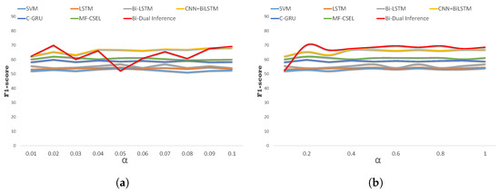 The results presented in Figure 11a clearly demonstrate that the proposed Bi-Dual Inference model outperforms other baseline models in terms of overall performance. Notably, the performance of the Bi-Dual Inference model is optimal when the sentence length is 20. On the other hand, the LSTM model also exhibits a noticeable trend. As the length of the training sentence increases, the model tends to forget more information, resulting in diminished performance.