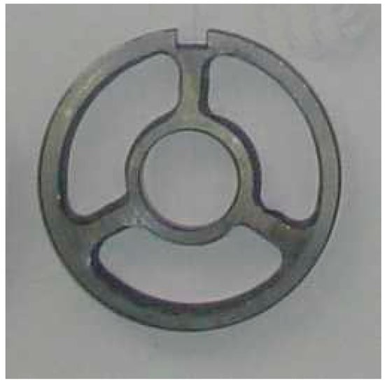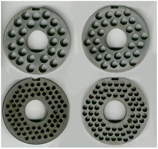According to Figure 2, the experimental press consists of the following main parts: a cylindrical body 1, a hopper 2, and a drain pan for collecting the liquid fraction 3. The cylindrical body 1 consists of grinding and pressing chambers. The grinding chamber is constructed of a conveying screw 4 and a grinding mechanism comprising a receiving plate 5 and a grinding plate 6, a knife 7, and a ring 8 mounted on the outside of the knife (Figure 3, Figure 4 and Figure 5). Three holes are cut on the receiving plate 5, and the holes are made in the direction of the raw material flow.