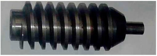 According to Figure 10, the press drive consists of an electric motor 13, a worm gearbox 14, and a V-belt transmission 15. The worm gearbox 14 is connected to the tail bearing support 17 via the chain transmission 16. The shafts of the press are connected to the tail bearing support, which is fixed to the welded frame 18. During the research, the speed of rotation of the shafts was changed by changing the pulleys of the V-belt transmission.