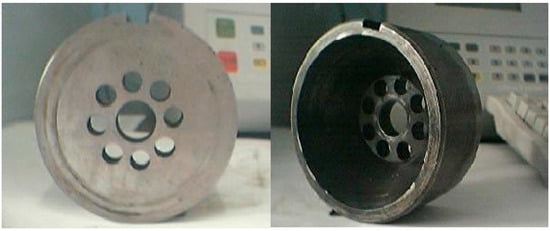 A uniform pitch of the screw guarantees constant equipment performance, and a uniform and sequential increase in the thickness of the screw in the direction of product movement increases the strength and reliability of the design. On the inner surface of the Zeer cylinder, grooves are cut for the flow of the liquid fraction through the holes, providing resistance to the rotation of the cake together with the screw and improving its transportation. At the end of the cylindrical body, a diaphragm cone and a tightening nut are installed (Figure 9). Holes are made in the diaphragm cone for thermoplastic molding (granulation) of the cake.