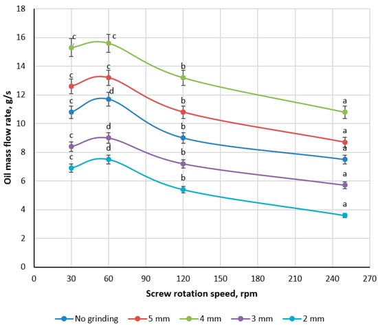 Dependence of oil mass flow rate on the degree of sunflower seed grinding and screw rotation speed (different letters above the lines indicate significant differences between samples, p < 0.05).