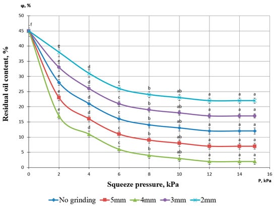 Dependence of residual oil content of cake on squeeze pressure and degree of grinding (different letters above the lines indicate significant differences between samples, p < 0.05).