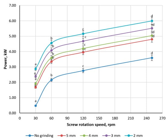 Dependence of power on the degree of sunflower seed grinding and screw rotation speed (different letters above the lines indicate significant differences between samples, p < 0.05).