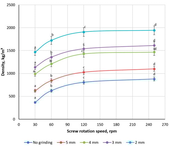Dependence of cake density on the degree of sunflower seed grinding and screw rotation speed (different letters above the lines indicate significant differences between samples, p < 0.05).