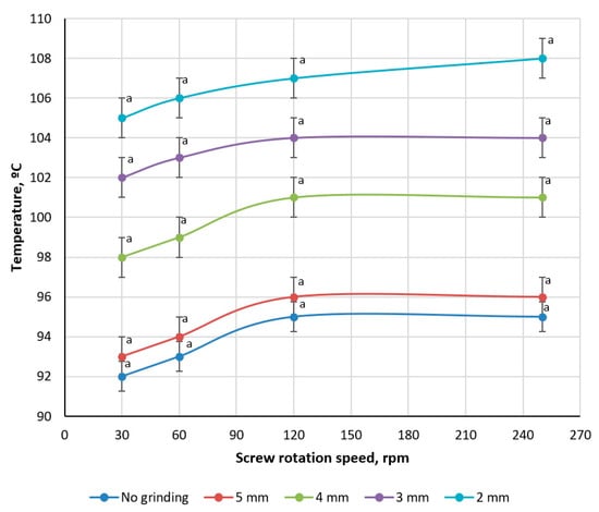 Dependence of temperature of seed cake on the degree of sunflower seed grinding and screw rotation speed (different letters above the lines indicate significant differences between samples, p < 0.05).