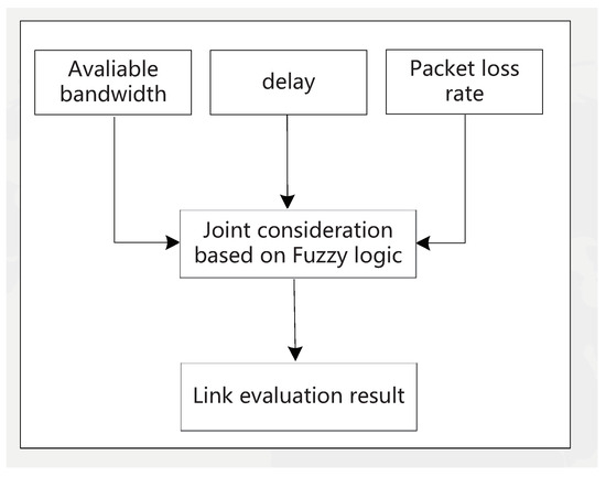In classical Boolean logic, “false” is usually denoted by 0, and “true” is denoted by 1; a proposition is either true or false. In fuzzy logic, a proposition is no longer either true or false; it can be thought of as “partially true”. Fuzzy logic uses non-numeric linguistic variables to express facts and further deals with approximate data in a manner similar to human reasoning. It comprises three main procedures (see Figure 3): first, convert the input values to fuzzy values, i.e., fuzzification. The degree to which the bandwidth of a link is part of the large, medium, and small categories is calculated using the bandwidth membership function. Similarly, the degree to which the delay belongs to the large, medium, and small categories and the degree to which the packet loss rate belongs to the large, medium, and small categories need to be calculated using the corresponding membership function. Then, IF/THEN rules are used to obtain the fuzzy output values. Those fuzzy output values are defined as fire strength (FS) and cannot solve real problems. Therefore, defuzzification can be used to obtain certain numerical values and set a threshold () for evaluation of links.