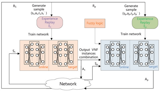 Figure 2 shows an illustration of the MRLF-SFCP. is used to adjust the parameters of the VNF placement neural network. is used to adjust the parameters of the traffic routing neural network. To achieve optimal SFC placement, first, we use to acquire the initial parameters of neural network. Then, the optimal combination of VNF instances is acquired using (DDQN1). Subsequently, a verification is conducted to ascertain the placement status of the necessary VNF instances on the designated cloudlets. If the required VNF instances do not exist, they are dynamically placed onto the corresponding cloudlets. Then, we utilize to acquire the initial parameters of (DDQN2). Additionally, to establish connectivity between the source and destination node, as well as the selected cloudlets generated by (DDQN1), MRLF-SFCP employs fuzzy logic for preliminary link evaluation and utilizes the DDQN algorithm to determine the optimal route. For instance, in Figure 1, there are four paths that need to be produced in a predefined order, namely, (IoT terminal, ), (, ), (, ), and (, src). We need to perform fuzzy logic and DDQN four times for traffic routing. In particular, the evaluation of link quality, considering factors such as available bandwidth, link and node delays, and packet loss rate, is performed using fuzzy logic. The evaluation result is input to (DDQN2) for routing selection.