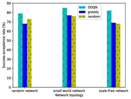We first use the trained VNF placing network to choose cloudlets for arrived IoT-SRs online. In order to evaluate the performance of the VNF placing network, simulations are carried out across three distinct network topologies, specifically RN, SWN, and SFN. In this experiment, we mainly compare the performance of three types of algorithms, namely machine learning algorithm DDQN, a greedy algorithm, and a random algorithm. When required VNFs of IoT-SR are not in the chosen cloudlets and there are insufficient resources to place VNF instances, we label the IoT-SR as "cannot be accepted" and set the reward as −200 directly. The simulation result is obtained by randomly setting CPU and bandwidth resources, and the average value of twenty experiments is taken into consideration. The success acceptance rate of IoT-SRs in various topologies is illustrated in Figure 6. It is evident from the results that the DDQN algorithm consistently attains the highest traffic acceptance rate. The the average acceptance rate of IoT-SRs using the DDQN algorithm across the three networks is 18.4% higher than that of the random method and 20.8% higher than that of the DLG.
