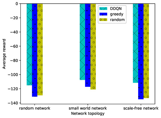 Figure 7 presents the average rewards of IoT-SRs under three networks. The simulation results demonstrate that under all network topologies, our proposed DRL-based method outperforms the other approaches by a significant margin. In most cases, the performance of the greedy method is inferior to that of the random method, as it always chooses the cloudlets with the lowest delay, easily making the resources of some cloudlets become very small after a number of IoT-SRs, while the random method selects all cloudlets with equal probabilities for each IoT-SR.