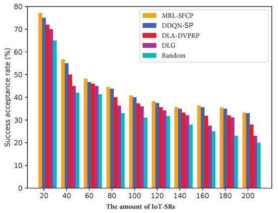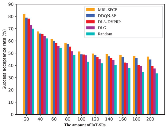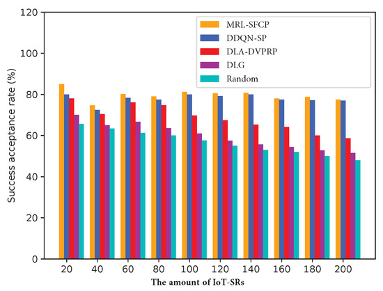 In Figure 8, an evaluation is conducted to compare the traffic acceptance rate within the RN topology. The IoT-SRs arrive at IoT-MEC networks randomly, and the required resources can be acquired only when they come into the network. The results indicate that in the majority of cases, MRL-SFCP exhibits superior performance compared to the other approaches. This finding signifies that the trained agent effectively guides the SDN controller in dynamically placing VNFs and identifying appropriate route paths. Additionally, with an increase in the number of IoT-SRs, as the DLG and random methods cannot dynamically place VNFs and they may fail to discover paths capable of serving IoT-SRs, they achieve poor performance. The DLA-DVPRP uses heuristic algorithms for path selection, achieving lower performance than MRL-SFCP and DDQN-SP. However, since the DLA-DVPRP can dynamically place VNFs, its performance is higher than that of the DLG and random methods.