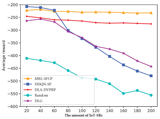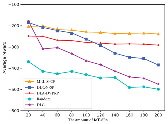 The average reward of IoT-SRs in the SWN topology is illustrated in Figure 11 as the number of IoT-SRs varies from 20 to 200. It can be observed that the MRL-SFCP algorithm attains the highest reward after 80 IoT-SRs. This phenomenon can be attributed to the consistent identification of the shortest path by DDQN-SP, rendering it well-suited for scenarios featuring a limited number of IoT-SRs. Nonetheless, as the number of IoT-SRs escalates, the DDQN-SP struggles to maintain a balanced utilization of network resources. This causes a rapid decline in the average reward after 80 IoT-SRs. The three other compared methods exhibit similar phenomena after 80 IoT-SRs. Based on the results obtained in the SWN, the proposed MRL-SFCP algorithm exhibits superior performance.