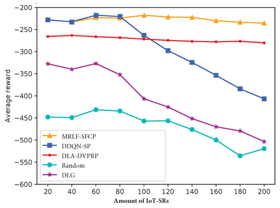 To facilitate a comprehensive understanding of the experimental findings, Figure 9 shows the mean reward of IoT-SRs in the RN. The defined reward in this study is comprised of the weighted summation of resource utilization cost and delay, aligning with our optimization goals. It is evident that the DDQN-SP surpasses the compared approaches solely when the count of IoT-SRs is less than 35. When the number of IoT-SRs is greater than 40, a noticeable and rapid decline is observed. Conversely, the proposed MRL-SFCP algorithm demonstrates minimal variation and achieves the highest reward. Based on these observations, it can be inferred that the performance of the MRL-SFCP algorithm surpasses that of other methods within the RN topology.