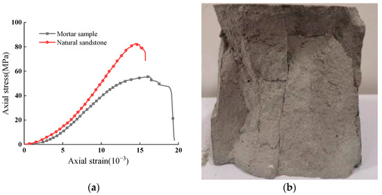 The stress–strain curve and failure diagram of complete mortar specimens. (a) The stress–strain curves of sandstone and mortar specimens. (b) Uniaxial compression failure diagram of mortar specimens.