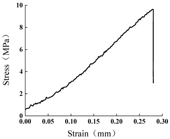 The testing machine records the axial strain and transverse strain of the specimen, which automatically generates the stress–strain curve from the collected data, and obtains the physical and mechanical indicators such as the elastic modulus, compressive strength, and Poisson’s ratio of the specimen. The test results are shown in Figure 5. Although the peak strength of the mortar sample is somewhat lower than that of natural sandstone [23], the stress–strain curve of both samples is consistent. After a brief period of compaction, the specimens entered the elastic stage. At the stage of approaching peak strength, significant plasticity appeared, and the slope of the stress–strain curve gradually decreased. During the middle stage of loading, small cracks appeared on the surface of the mortar sample. As the sample approached its peak, small cracks gradually expanded, and as the load continued to increase, larger cracks formed. The sample suddenly fractured, and the axial stress rapidly decreased after the peak. The fracture mode of the complete mortar sample was also relatively consistent with the traditional uniaxial compression failure mode of rocks, both of which were shear failure with an inclination angle of nearly 45°.