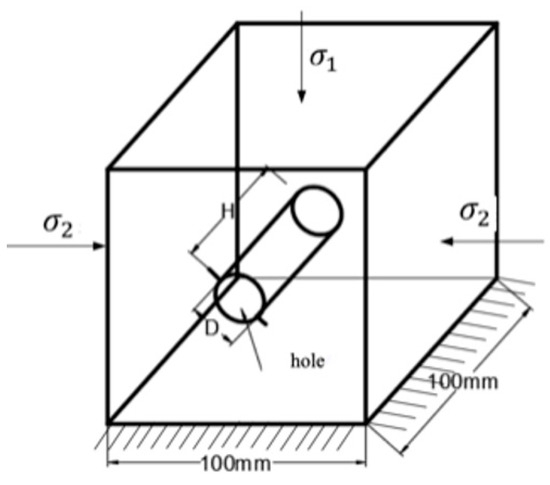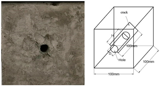 The finished specimen and the schematic diagram are shown in Figure 7. As shown in Figure 7, D is the diameter of the hole and H is the depth of the hole. In the sample, the diameter D = 10 mm, the crack length C = 30 mm, and the crack is a penetrating crack. This test is a total of six groups; respectively, H = 0 mm, H = 20 mm, H = 40 mm, H = 60 mm, H = 80 mm, and H = 100 mm, and each group of biaxial compression specimen number is three groups.