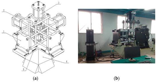 The true triaxial electro-hydraulic servo rock fracture seepage testing machine (from the Nanjing Hydraulic Research Institute). (a) 1. X-axis loading system, 2. Y-axis loading system, 3. normal loading system, 4. base platform, 5. pressure rail. (b) Instrument image.