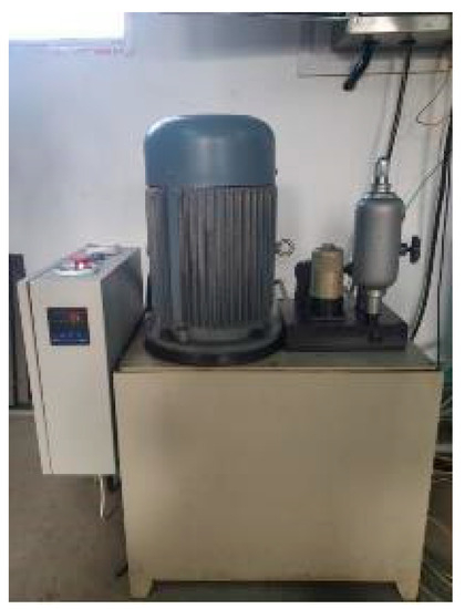 The hydraulic source system consists of an oil tank, a 7.5 kW electric motor, a 10 L/min axial piston pump, a cooling system, a valve group, a control cabinet, etc., as shown in Figure 10. The valve group includes a one-way valve and a manual overflow valve, which can adjust the required pressure according to different tests and be observed through a pressure gauge. A precision oil filter is used to ensure the cleanliness of the system oil.