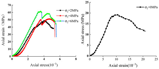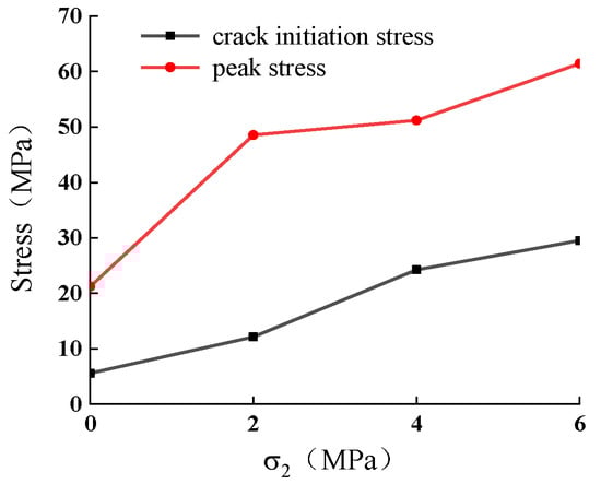 Biaxial compression tests of through-type hole-crack specimens are carried out, keeping the steady lateral pressure σ2 at 0 MPa, 2 MPa, 4 MPa, and 6 MPa. As shown in Figure 12, when there is no lateral pressure (σ2 = 0 MPa), the peak strength of the specimen is 21.22 MPa. When the lateral pressure σ2 = 2 MPa, the peak strength is 48.55 MPa: an increase of 273%, which significantly increased the peak strength of the specimen. Also, the peak strain is significantly reduced compared to no lateral pressure, due to the limitation of lateral stress. With the increase in lateral pressure, the peak strength of the specimens shows varying degrees of increase. At the lateral pressure σ2 = 4 MPa, the peak strength of the specimen is 51.21 MPa, which is an increase of about 5.5% compared to the peak strength at σ2 = 2 MPa. At the lateral pressure σ2 = 6 MPa, the peak strength of the specimen is 61.44 MPa, which is a 16.7% increase compared to the peak strength at σ2 = 4 MPa. According to the trend of peak stress and crack initiation stress shown in Figure 13, both peak stress and crack initiation stress increase with the increase in lateral pressure. In particular, when the lateral pressure is increased from nothing to something, the increase in peak strength increases significantly. As the lateral pressure continues to increase, the increase in peak strength decreases. The mechanical properties of the specimens under different lateral pressures are shown in Table 2.