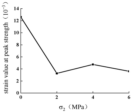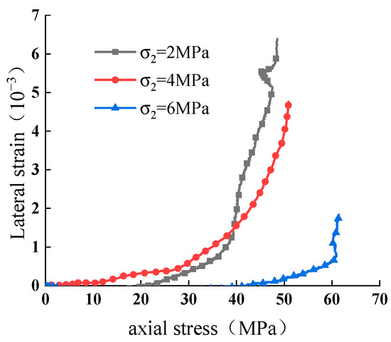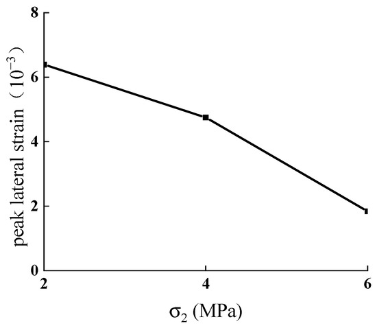 Deformation is one of the important factors in determining the stability of rock masses. Therefore, a study of the specimen peak strain is carried out. The variation in peak strain with lateral stress in the test for through-type hole-cracked rocks is shown in Figure 14. The strain value at peak strength is in the range of 3.5 × 10−3–5 × 10−3; it does not show an increase with the increase in lateral pressure, and the larger value of the peak strain appears at the lateral pressure σ2 = 4 MPa. The lateral displacement of the specimens under different lateral pressures is also different, and the variation in lateral displacement with load is shown in Figure 15. The lateral displacements change gently in the pre-loading period. The lateral displacement shows a sharp upward trend in the middle and late stages of loading, which is due to the beginning of severe plastic damage of the specimen and weakening of the bearing capacity, resulting in a significant increase in lateral displacement. As shown in Figure 16, the peak lateral strain decreases with increasing lateral pressure. When the lateral pressure σ2 = 2 MPa and σ2 = 4 MPa, the reduction in lateral strain is smaller. At the lateral pressure σ2 = 6 MPa, the lateral strain decreases significantly, reflecting that its lateral confinement effect becomes more prominent as the lateral pressure increases.