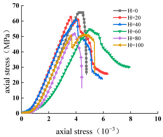 In order to analyze the variation in the mechanical properties of the hole-crack rock with hole depth, specimens with hole depths of 0 mm, 20 mm, 40 mm, 60 mm, 80 mm, and 100 mm, and with penetration cracks, are made. The steady lateral pressure of σ2 = 4 MPa is chosen for the test, and the axial stress–strain curve obtained is shown in Figure 17. Under the action of lateral pressure, the peak strength of the specimen shows a decrease with the increase in hole depth, but the magnitude of change is relatively gentle, and the peak stress is maintained between 50 MPa–70 MPa.