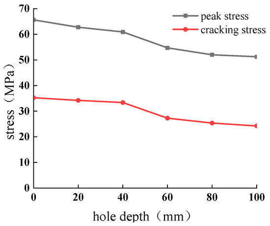The variation curve of peak stress and cracking stress is shown in Figure 18. When the hole depth in the hole-crack specimen is from 40 mm to 60 mm, the peak stress decreases more significantly, by about 10%. In this process, the hole depth exceeds 50% of the specimen length. The main deformation area of the sample is the hole and crack area, which changes the stress distribution structure. Excessive deformation on the porous side leads to inconsistent deformation before and after the test, leading to unstable failure of the sample. This is also confirmed by the consistent trend of the crack initiation stress with the peak stress in the graph. Except for the rest of the hole depth variation stages, the peak stress decreases by about 3% for every 20 mm increase in hole depth.