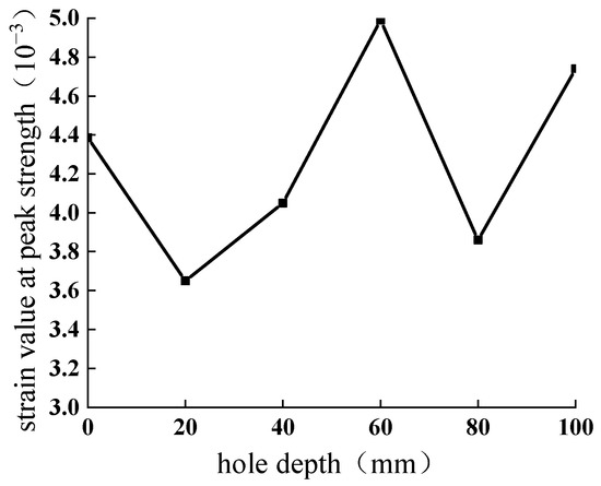 Strain value at peak strength of specimens with different hole depths under lateral stress σ2 = 4 MPa.