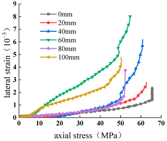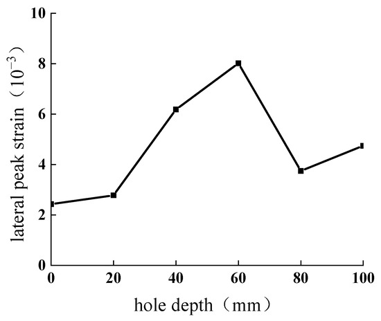 Figure 19 shows the trend of the axial peak strain of the specimens. At 4 MPa lateral pressure, the axial peak strain does not increase linearly with increasing hole depth, and the maximum peak strain occurs at a hole depth of 60 mm. The variation in the lateral strain curve with axial stress is shown in Figure 20. Due to the restraining effect of lateral pressure, the curve changes gently in the early stage with a small slope, and then the curve suddenly becomes steeper and the slope increases rapidly when it approaches the peak stress. The variation curve of lateral peak strain with hole depth is shown in Figure 21. Similarly to the axial peak strain, the maximum value of the lateral peak strain occurs at a hole depth of 60 mm. The mechanical properties of the specimens with different hole depths under 4 MPa lateral pressure are shown in Table 3.
