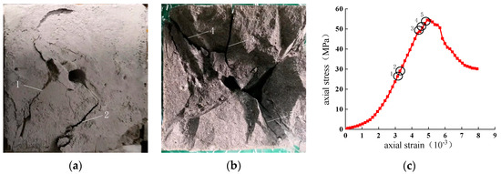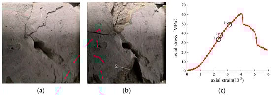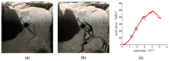 The secondary crack initiation point of the specimen is at the tip of the prefabricated crack. It is shown that the stress concentration caused by cracks is more pronounced during the compression process due to the difference in geometric characteristics of cracks and holes. The initial crack initiation angle is larger compared to the control test without lateral pressure. As shown in Figure 22a, crack No. 1 is a standard wing crack with an extension angle of 90° at about 37% of the peak stress. With the increase in load, the No. 2 wing crack appears at 50% of the peak strength, and the No. 2 wing crack extension angle is also 90°. Unlike the results of the uniaxial control test, the expansion direction of the wing crack does not shift to the main stress direction with the increase in the load, but continues to expand in the crack initiation direction until penetration, and the wing crack gradually widens with the increase in the axial load, as shown in Figure 22b, 1+. As the crack becomes wider, the slope of the curve decreases significantly at 82.4% of the peak. Near the peak strength, the potential energy is converted into the surface potential energy required for crack expansion due to the continuous expansion and widening of existing cracks, releasing most of the potential energy so that no new cracks are generated until the specimen is completely destroyed at the peak load. The stress–strain curve of the specimen and the crack stress point location are shown in Figure 22c.