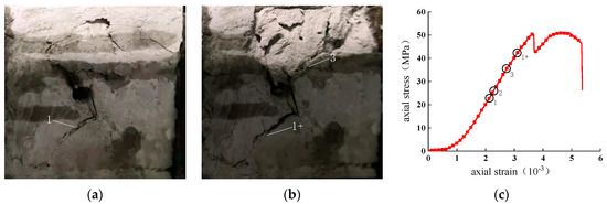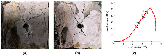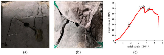 At H = 40 mm, the No. 1 wing crack appears first at 54% of the peak strength, as shown in Figure 27a. As the load increases, the width of the No. 1 crack increases and the No. 2 wing crack with a cracking angle of 90° appears at the lower end, when the load is about 60% of the peak stress. The wing cracks in the upper and lower of the specimen widen continuously under the axial load, causing obvious dislocation of the holes along the prefabricated cracks. And, the internal cracks gradually crack completely leading to the splitting of the specimen into two parts, as shown in Figure 27b. The stress–strain curve develops a clear plastic characteristic after the obvious widening of crack No. 1, with the continued widening of cracks No. 1 and No. 2, as shown in Figure 27c where the specimen reaches its peak after position 1+.