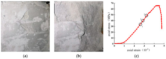 At this time, the lateral pressure σ2 = 4 MPa and the specimen contains only prefabricated single cracks, the crack extension evolution process and stress–strain curve obtained are shown in Figure 25. As shown in Figure 25a, the starting point of the secondary crack appears at the tip of the precast crack and the standard wing crack appears at the upper end, appearing and expanding at an angle of extension of 90°. For example, the No. 1 crack appears at 53% of the peak strength with a stress of about 35 MPa, and the No. 2 wing crack appears at 40 MPa; the No. 3 anti-wing crack appears at about 70% of the peak strength. Compared with no lateral pressure, the wing cracks appear later and have a larger crack initiation angle. There is no tendency of vertical bias in the direction of secondary wing crack expansion. This is similar to the results of biaxial compression tests on specimens with penetration holes, indicating that lateral stresses have an effect on the direction of crack extension.