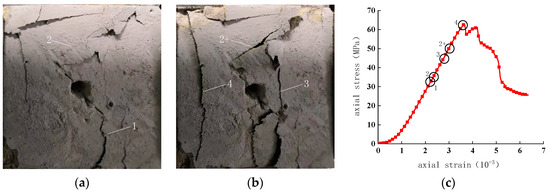 When the lateral stress σ2 = 4 MPa, the peak strength of the specimen is elevated and the initial cracking stress of the crack is higher at the same time. The initial crack at the No. 1 wing crack in Figure 23a appears at 24 MPa, which is about 48% of the peak strength, followed by a No. 2 wing crack at 50% of the peak strength at the upper end of the pre-crack of the specimen, with an extension angle of about 90°. The precast hole is a penetration hole, so a stress concentration point is formed at the intersection of the hole and the crack, and the No. 3 wing crack in Figure 23b appears at this intersection when the stress reaches 72% of the peak strength, and the extension angle is still 90°. All of the wing cracks do not shift the crack expansion angle during the expansion process, and all of them expand according to the initial crack angle until they penetrate the specimen. The stress–strain curves of the specimens are shown in Figure 23c. The appearance of cracks 1 and 2 can be attributed to the extension of the prefabricated cracks without significant fluctuations in the stress–strain curves. However, the appearance of crack No. 3 lead to large stress fluctuations in the specimen, and although there is no complete loss of load capacity, the curve already shows obvious plastic characteristics, and then the specimen is rapidly destroyed.