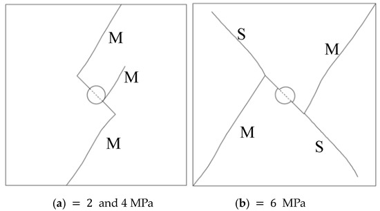 The presence of cracks leads to stress concentration at the tip, which makes the initiation point of secondary cracks in the specimen appear at the prefabricated crack tip. The analysis is carried out for different types of crack extension damage of the specimen according to the final failure pattern of the specimen. When the lateral pressures of the specimens containing penetration cracks are σ2 = 2 MPa and 4 MPa, the secondary crack classification diagram is shown in Figure 30a. Due to the limitation of the lateral pressure, the expansion direction of secondary cracks is not shifted to the axial stress direction, and the crack expansion mode is mainly compound cracks. When the lateral pressures of the specimens containing penetration cracks are σ2 = 6 MPa, the crack extension pattern is shown in Figure 30b. The high lateral pressure increases the peak strength and leads to severe misalignment of the specimen holes along the prefabricated crack. The secondary cracks are not only compound cracks, but also coplanar shear cracks that crack along the direction of the prefabricated cracks.
